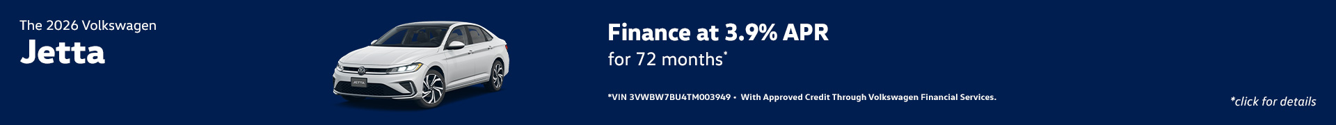 *Example: 2026 Volkswagen Jetta 1.5T Sport $27,101 MSRP. Model Code BU52RS. VIN 3VWBW7BU4TM003949. Stock#V26001. 4 cylinder engine, 8-speed Automatic w/ Tiptronic® transmission, 4dr Car. *APR finance offer 3.9% for 72 months with approved credit through Volkswagen Credit with tier 1 approval (720+ beacon score). $15.60 per month, per $1,000 financed. Not all will qualify. Must take delivery from retail stock. Prior sales excluded. Offer subject to change. Offer expires on 03/02/2026.