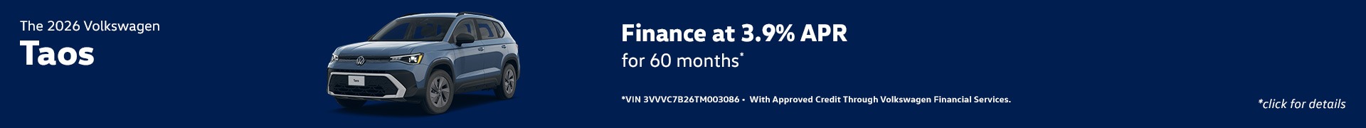*Example: 2026 Volkswagen Taos 1.5T SE $34,236 MSRP. Model Code CL23SR. VIN 3VVVC7B26TM003086. Stock#V26020. 4 cylinder engine, 8-speed Automatic w/ Tiptronic® 4MOTION® transmission, Sport Utility. *APR finance offer 3.9% for 60 months with approved credit through Volkswagen Credit with tier 1 approval (720+ beacon score). $18.37 per month, per $1,000 financed. Not all will qualify. Must take delivery from retail stock. Prior sales excluded. Offer subject to change. Offer expires on 03/02/2026.