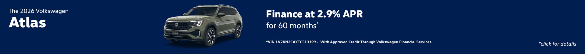 *Example: 2026 Volkswagen Atlas 2.0T SE w/ Technology $48,906 MSRP. Model Code CA37PR. VIN 1V2KN2CAXTC513199. Stock#V26009. 4 cylinder engine, 8-speed Automatic w/ Tiptronic® 4MOTION® transmission, Sport Utility. *APR finance offer 2.9% for 60 months with approved credit through Volkswagen Credit with tier 1 approval (720+ beacon score). $17.92 per month, per $1,000 financed. Not all will qualify. Must take delivery from retail stock. Prior sales excluded. Offer subject to change. Offer expires on 03/02/2026.