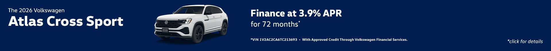 *Example: 2026 Volkswagen Atlas Cross Sport 2.0T SEL R-Line Black $53,633 MSRP. Model Code CMD8PR. VIN 1V2AC2CA6TC213693. Stock#V26033. 4 cylinder engine, 8-speed Automatic w/ Tiptronic® 4MOTION® transmission, Sport Utility. *APR finance offer 3.9% for 72 months with approved credit through Volkswagen Credit with tier 1 approval (720+ beacon score). $15.60 per month, per $1,000 financed. Not all will qualify. Must take delivery from retail stock. Prior sales excluded. Offer subject to change. Offer expires on 03/02/2026.