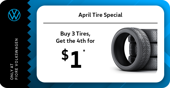 *Available on select sets of four Continental, Goodyear, Hankook, and Pirelli tires that meet specifications of vehicle's Owner's Manual. Must be purchased through Volkswagen Tire Store. May be combined with select offers. Mounting, balancing, and taxes are not included. The fourth tire will be reimbursed on the front tire for staggered fitments. Volkswagen Group of America, Inc., is not the seller or warrantor, nor does it recommend any tires other than those identified as OEM. Offer valid 04.01.26 through 04.30.26. Tires must be installed by 05.07.26. Valid at a participating Volkswagen dealership only. See participating dealer for complete details.